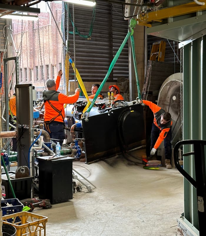 Moving it into the plant room was like threading a needle. The skill shown by the riggers from SP Rigging and the Borger Cranes operator made the whole process look effortless.